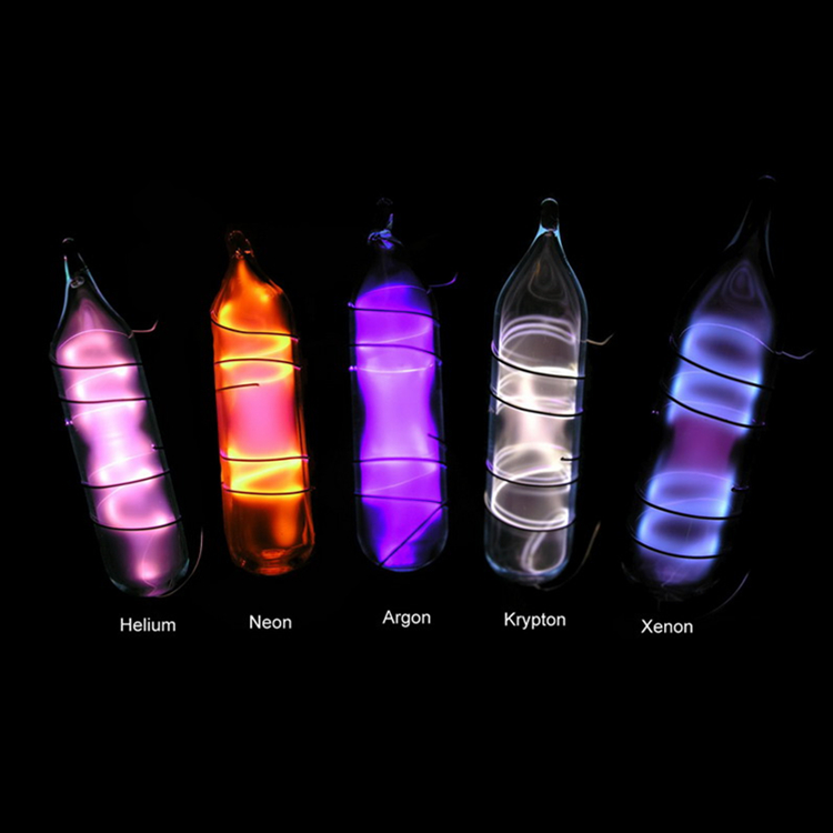 不同的氣體在不同的條件下會發(fā)出不一樣的光,一般氦氣—-橘紅 ,氖氣—-紅,氬氣—-藍(lán)紫氪氣—-黃綠,氙氣—-與陽光顏色相同。